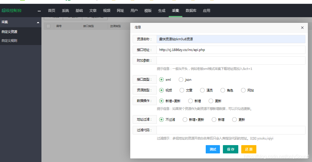 八、进入到采集菜单,添加自定义采集资源库