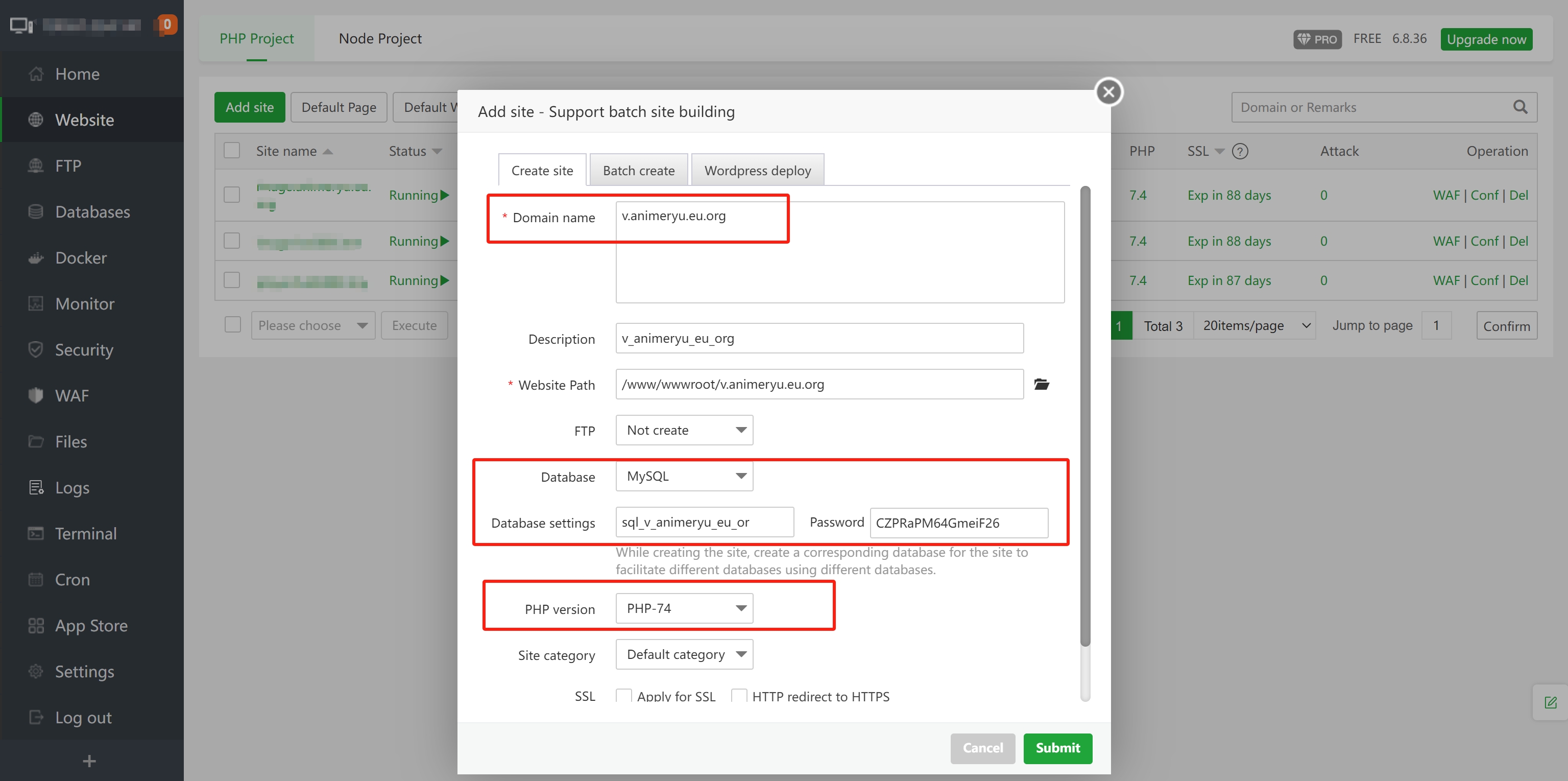 1、新建超级播放器网站,php7.4版本,创建数据库