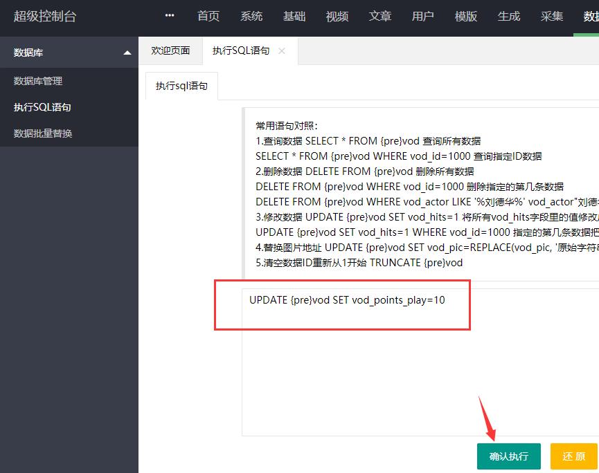 SQL语句2:UPDATE {pre}vod SET vod_points_play=10WHERE vod_id=1000(此句的意思,视频ID为1000的视频,设置为10积分收费)