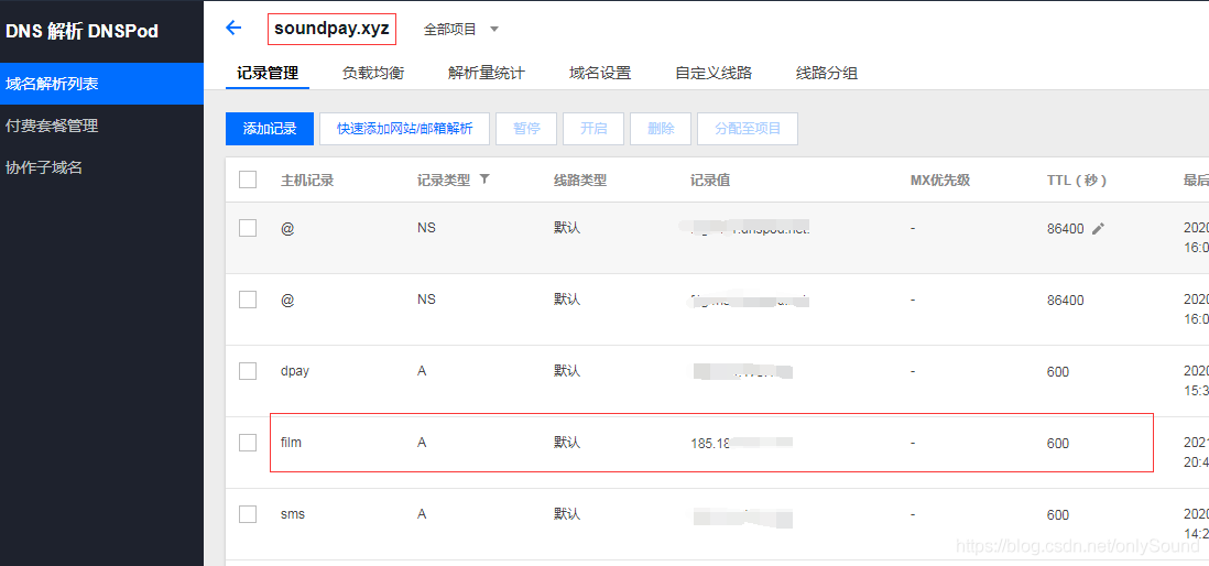 三、绑定域名解析,我用的是腾讯云的域名,把对应的域名解析到当前的免费的虚拟主机IP上
