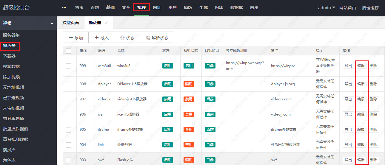 来到苹果cms系统后台---视频---播放器---找到你所使用的播放器然后进入编辑