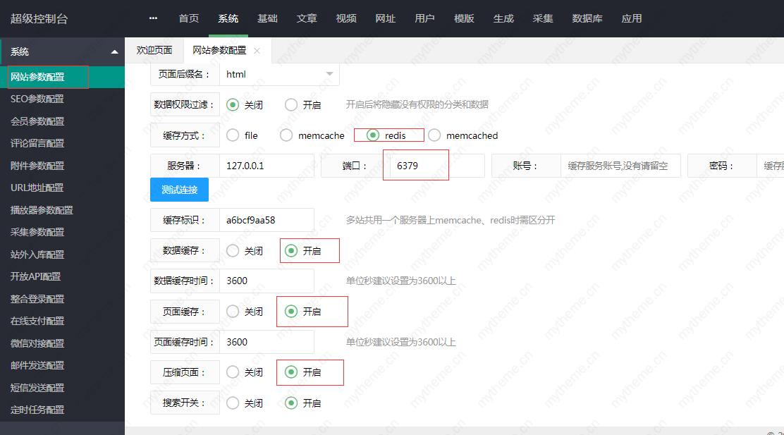 4,进入苹果CMS后台,网站参数设置-性能优化,缓存方式设置为Redis,IP:127.0.0.1端口:6379然后测试连接 连接成功代表能正常使用该缓存,然后开启:数据缓存/页面缓存(如下图)