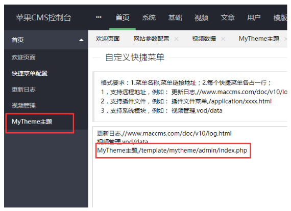 菜单填写格式:MyTheme主题,/template/mytheme/admin/